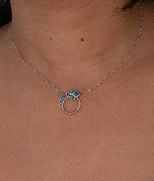 Sterling Silver Blue Opal Leaf Circle Necklace